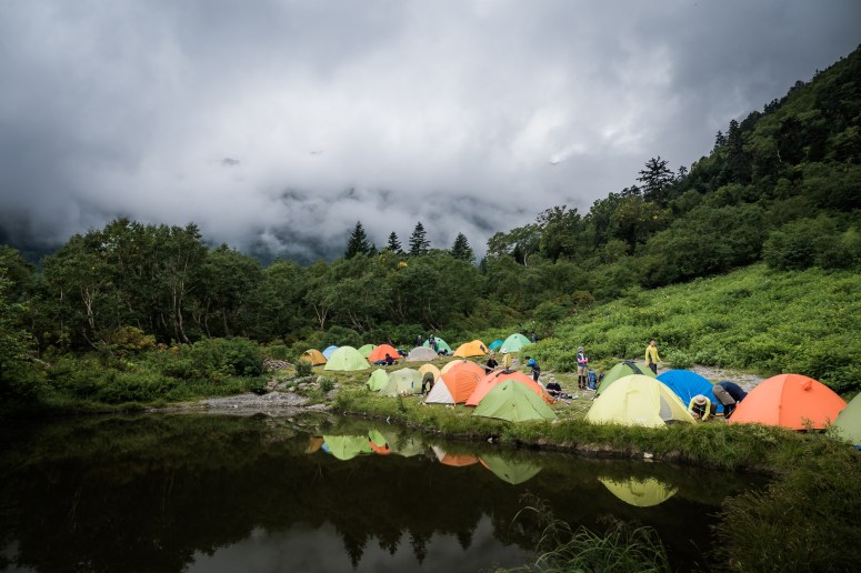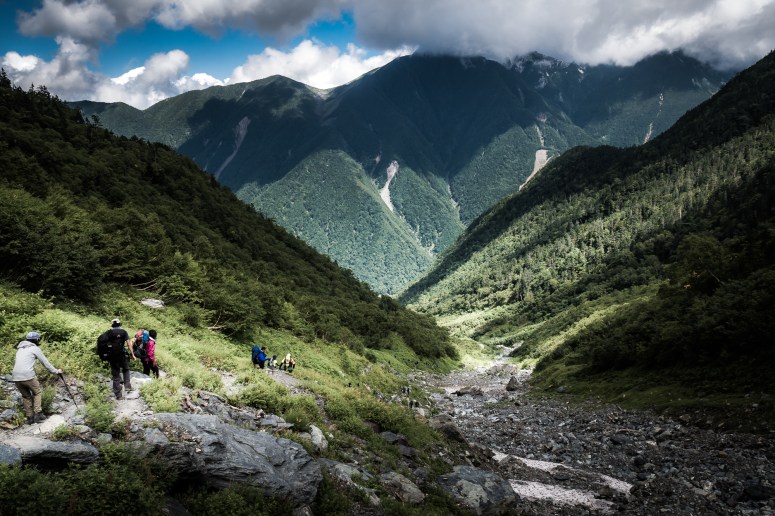 After this place with half an hour trekking through the forest, we reach to the river in the valley named Ookanbazawa (大樺沢二俣) where the top of this river is the mountain ridge.